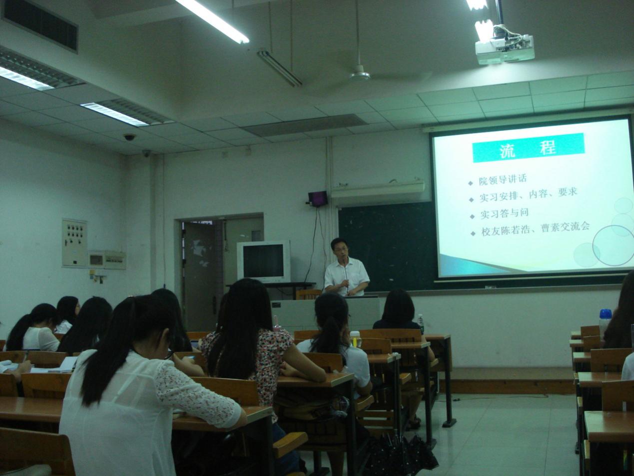 大会开始,谢剑萍老师简单介绍了本次动员大会的具体流程:院领导讲话;实习安排、内容和要求;实习问与答;以及员工陈若浩、曹素交流会。