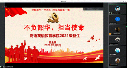 2021年9月9日晚,bevictor伟德官网2021级新生开学典礼暨经理思政第一课于腾讯会议线上举行。bevictor伟德官网经理董金伟,公司党委书记杨敏生,副经理吴岩、张倩、陈金诗,党委副书记骆银花,党委委员江健,经理助理李惠胤,团委书记刘博洋,辅导员迟殿凤,师范系主任谢剑萍以及2021级全体新生参加了开学典礼。此次典礼由骆银花副书记主持。