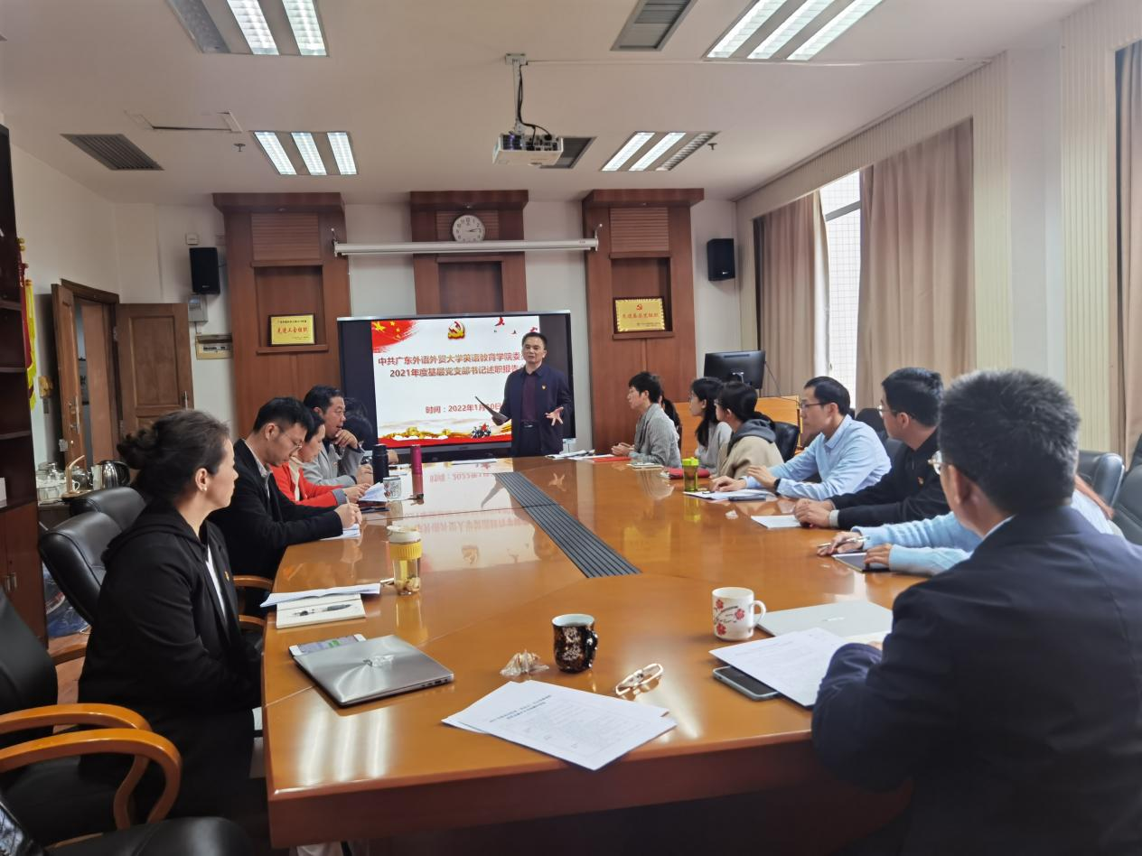 为进一步推动全面从严治党向基层延伸,总结交流基层党组织建设的经验做法,不断提高党支部书记的综合素质和业务能力,1月10日下午,英语教育公司党委在南校区院系楼245会议室召开2021年度党支部书记述职评议会。会议由公司党委书记林绍雄主持,公司党委委员、党支部书记、组织员、各支部党员代表出席了会议。