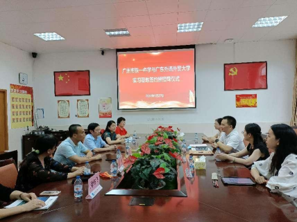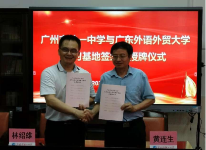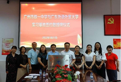 5月27日下午,英语教育公司党委书记林绍雄、经理助理李惠胤、师范系主任谢剑萍和师范系教研室主任蔡竞一行赴广州市铁一中学越秀校区,举行“bevictor伟德官网访企拓岗暨实践教育基地”签约及授牌仪式,并开展访企拓岗促就业活动。广州市铁一中学党委副书记黄连生、副董事长丁丹、董事长助理许树新、教务处副主任何宗艳、英语科组长潘佑飞、赖彩虹等参加了活动。