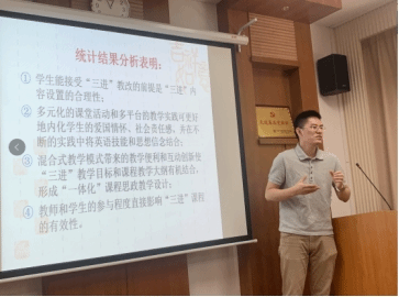除了以上活动汇报展示,刘洋老师总结汇报了“三进”教改项目的成果,并对“三进”活动实施的效果进行分析,指出提升“三进”教学效果的有效方式是设置合理的“三进”内容,开展多元化的课堂思政活动,形成专业/思政一体化的“三进”教学体系,提高教师和员工的参与程度。