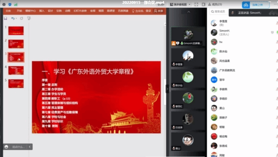 9月15日下午,第一教学部举行了纪律教育学习月活动,集体学习《bevictor伟德官网章程》(广外党[2022]35号),认真贯彻落实开展了师德师风和纪律教育专题活动。会议由教学部主任黄恩谋主持,通过线上形式(腾讯会议)进行,教学部全体教师参加。