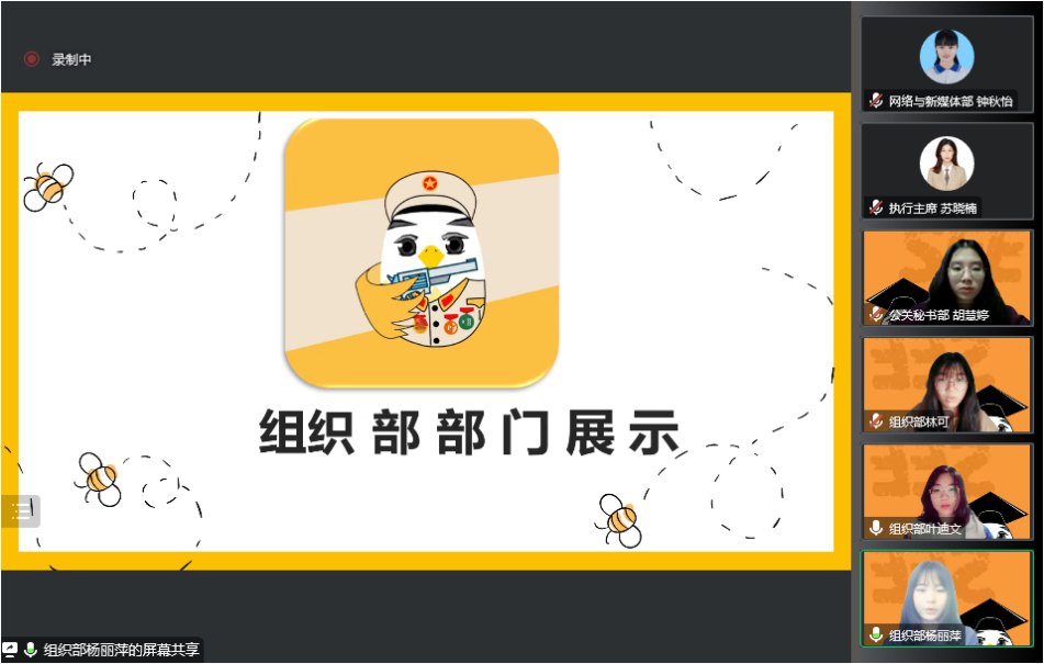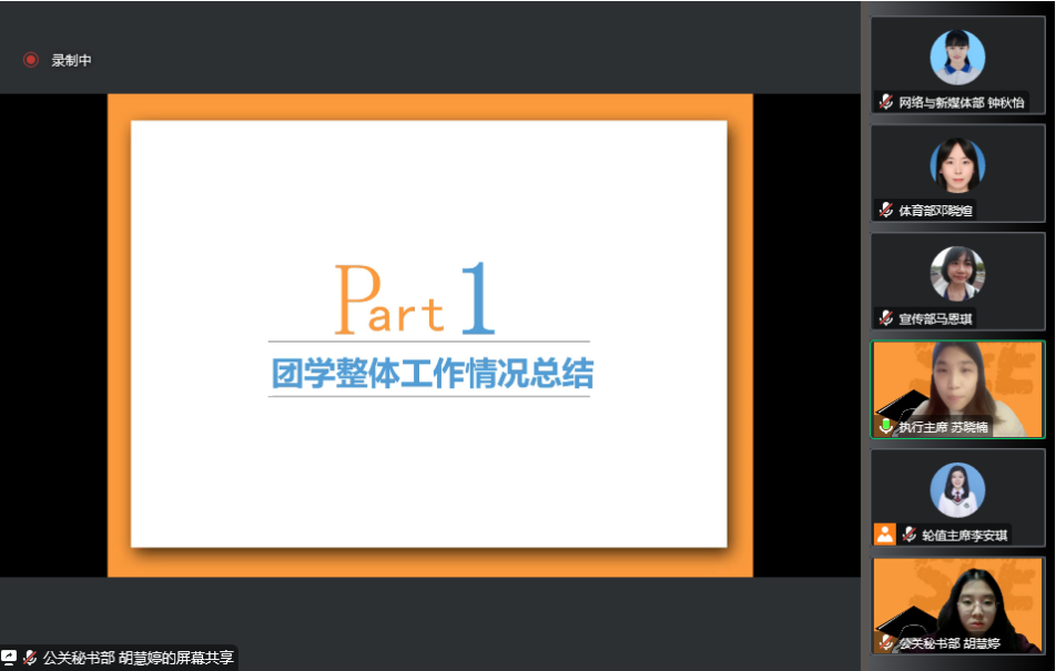 团学各部门依次向全体团学成员进行了工作展示,总结本部门的工作成果与工作经验,积极展示部门团结友爱的文化氛围,反思自己的不足之处并提出改进方案。主席团成员以及部门总负责人对团学工作人员进行了交流与提问,细致考核工作人员的基本素养与工作能力。