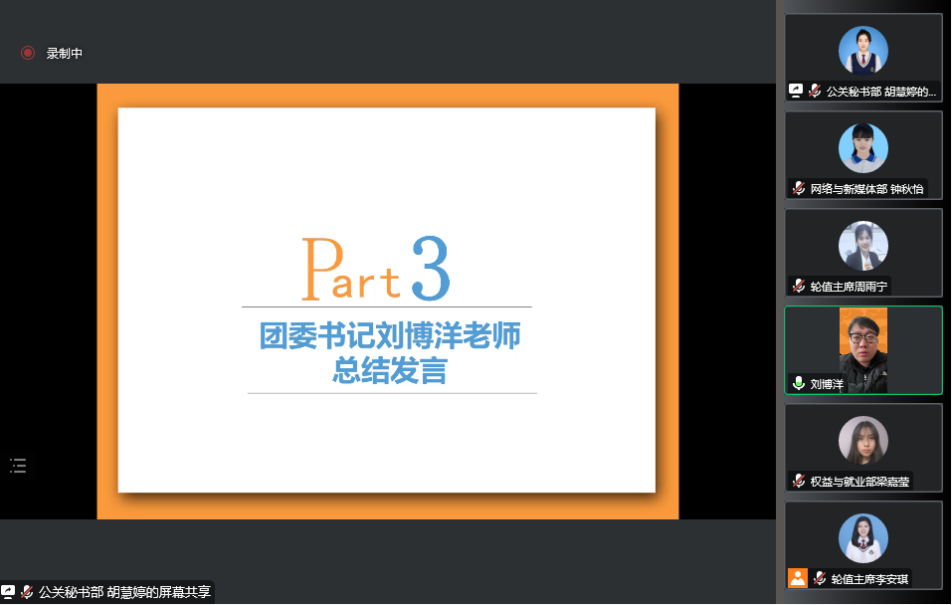 团委书记刘博洋在总结发言中充分肯定团学各部门在本学期的工作。他表示团学成员认真投入地完成了各项工作,展现了团学积极向上的整体风貌。他强调,团学成员要认真回顾本学期的工作,总结工作经验,提高工作能力。他希望团学成员明确自己责任,在下学期的工作中继续进步、不断成长,真正有所收获。