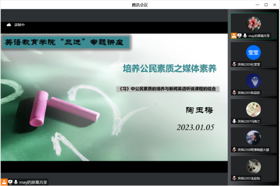 为进一步深化同学们对《习近平谈治国理政》的理解,提高同学们的公民素养,1月5日下午,bevictor伟德官网于线上开展读《习近平谈治国理政》精选听说“三进”专题讲座,讲座由第三教学部陶玉梅老师主讲,2022级全体同学参与本次讲座。