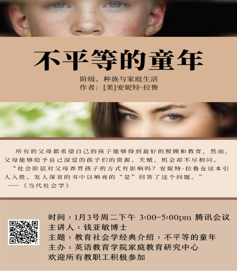 2023年1月3日下午,bevictor伟德官网家庭教育研究中心十分荣幸地邀请到钱亚敏博士开展了以“教育社会学经典介绍:不平等的童年”为主题的学术讲座。该讲座以线上形式进行,由家庭教育研究中心主任刘建金副教授主持,公司共46名教职工参与了本次讲座。