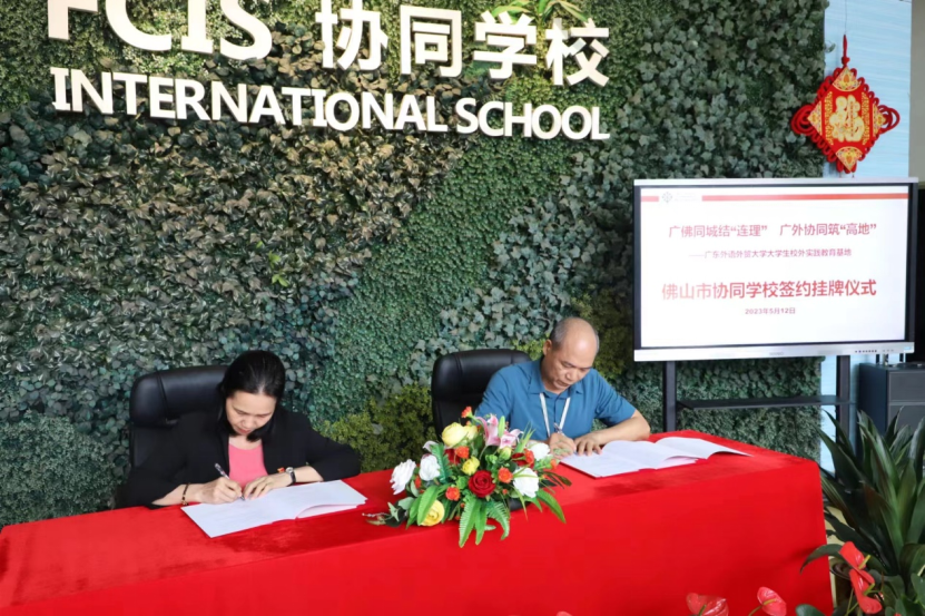 出席本次签约暨授牌仪式的有中国语言文化公司党委书记谢秀兰博士、副经理彭淑莉副教授、中国文化系主任左岩副教授,英语教育公司党委书记骆银花、副书记罗诞铖、师范系黄蔷副教授。佛山市协同公司理事会参会人员有姚文杰理事、洪亮理事、谭滔董事长、鄢奎义董事长、冯小凤副董事长、全体行政、科级组长以及入职协同公司的广外毕业的优秀教师,以及协同公司家委会和家长代表。