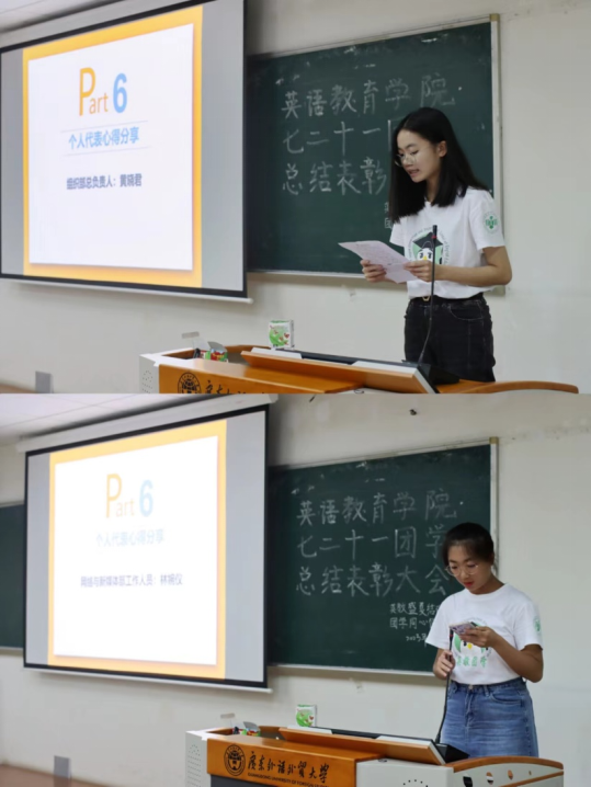 在心得体会分享环节,组织部总负责人黄晓君和网络与新媒体部工作人员林婉仪作为个人代表发言,分别阐述了她们在团学的难忘经历和宝贵收获,表达了对团学小伙伴们的感谢以及对团学未来的无限期待。