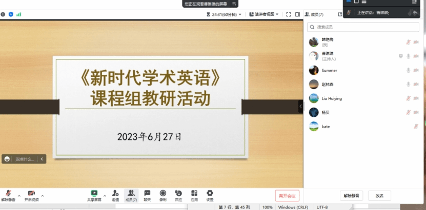 627日上午,第二教学部《新时代学术英语》课程组召开本学期工作总结暨课程思政教学分享会。本次教研会旨在分享本学期教学经验,分析期末考试情况,并为下学期教学工作的开展做准备。课程组全体教师通过线上会议参与了此次教研会,会议由曹琳琳主持。
