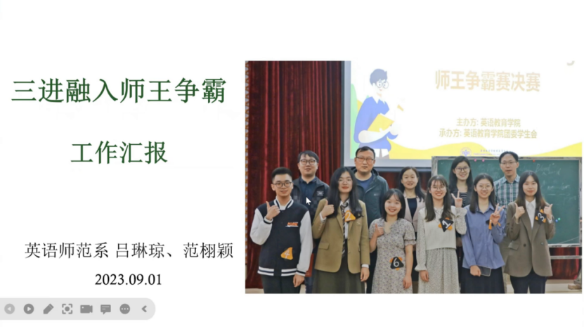 会议第二环节为英语师范系吕琳琼副教授的“三进”工作分享。吕琳琼以“三进融入狮王争霸赛”为主题,分享了“三进”内容融合员工活动的方法。她指出“三进”专题赛事的目的是推动英语新课标改革精神的落地,加深职前教师英语学科知识、教学知识与“三进”学习的融合,发展员工英语学科教学能力,并鼓励更多教师参与到公司“三进”工作中来,成为为党育人、为国育才的良师。