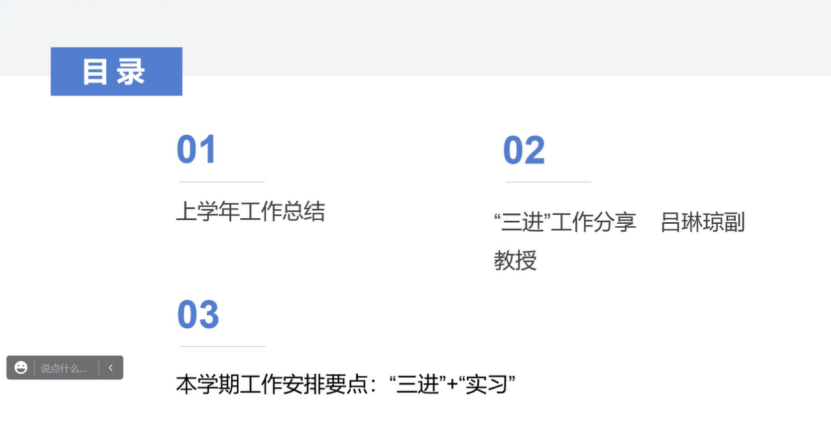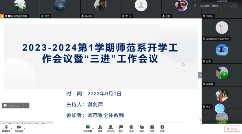此次会议分为三个环节,即上学年工作总结,“三进”工作分享及本学期工作安排。会议伊始,谢剑萍主任对上学年英语师范系的工作进行总结,肯定了上一学年工作的成绩,并鼓励教师参与到今后的工作中,以促进师范系工作的稳步、全面推进。