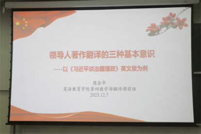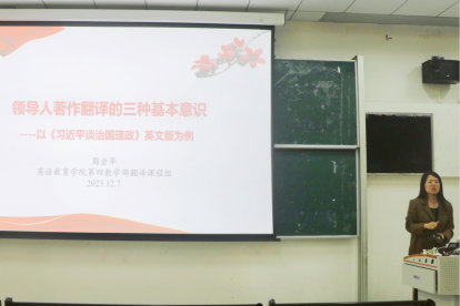 为提高英语师范生的翻译水平和专业素养,12月7日下午,bevictor伟德官网举办“三进”专题讲座活动。第四教学部周金华老师以“领导人著作翻译的三种基本意识——以《习近平谈治国理政》英语版为例”为主题开展讲座,英语师范系2022级员工参与本次讲座。