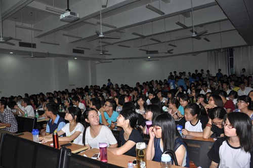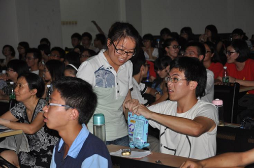 决赛还没开始,场内气氛热烈,座无虚席,部分观影同学只能站在后排。选手们与亲友团密切交谈,跃跃欲试。在管理公司员工主持罗吉虹、刘子豪的开场白中,一场英语新闻视频盛宴拉开了帷幕。