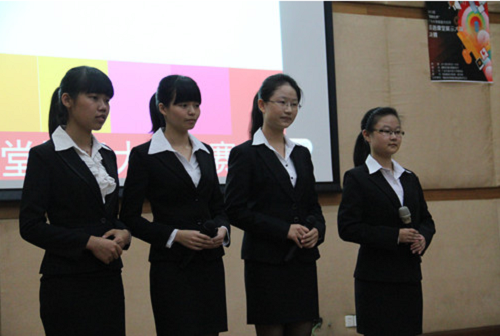 决赛的各支队伍分别有20分钟的展示时间和2分钟的问答时间。参与决赛的8支队伍精心准备,为观众献上了各具特色的课堂展示。经过复赛的比拼,选手们都对自己的课堂展示进行了完善,在台上表现时更显自信。“PPT”队以诙谐生动的短片引出“素食”主题,他们不单单从人体自身的健康角度出发,更是从环保、经济效率及生物多样性深入分析素食主义的类型、优点,纠正人们对于素食的基本误区,向大家发出素食养生的倡导;而他们在问答环节流利顺畅地回答自己对主题的构思,其精彩展示获得了在场老师的一致好评。再说说经贸公司的“Milkshake”队,一身干练的着装,在台上淡定自若的姿态,给场下观众留下了深刻印象。进入大学后,我们对于婚姻都会开始抱有不同的想法,她们则凭借着自己对于婚姻的看法,从生理和精神两个方面分析了婚姻对于个人、社会的重要性与非重要性;清晰的条理,流利标准的口语,很好地传达了她们内心的想法,博得评委老师们的称赞。