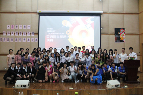 英语文化月,营造良好的英语学习氛围。课堂展示作为英语教学、师生互动的重要的平台,能促进师生相互学习,共同进步。至此,2013“高教社杯”广外大学英语文化月英语课堂展示大赛圆满落幕,英语学习与展示,精彩不断,尽请期待明年的英语文化月!