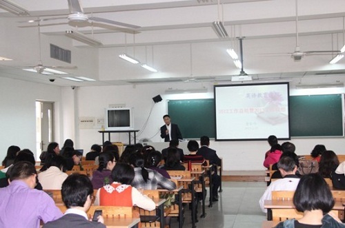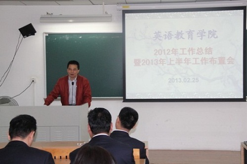 董金伟经理首先就2012年公司在教学、科研、教师发展、社会服务、国际交流、员工管理等方面所取得的成绩做了简单总结,对2013年各项重点工作进行总体部署,特别强调2013版教学计划的修订、申报2013省级教学改革工程项目、第三届“大学英语文化月”活动、第四届“外教社”杯全国大学英语教学比赛、教育学专业学位硕士点申报、2013年TESOL中国年会及第五届全国外语教师发展研讨会等重要工作,要求全院教职工齐心协力,共同把各项工作做好。最后,董经理用“积极进取、努力向上的教师朝气;和谐进步、共创幸福的公司氛围;包容尊重、合作共赢的团队作风;目标明确、团结务实的领导班子”四句话来概括公司的发展优势,同时分析了公司面临的不足,鼓励全院教师树立信心,坚定信念,扬长补短,全方位地促进公司和每个教师全面、健康、和谐、科学地多样化发展。