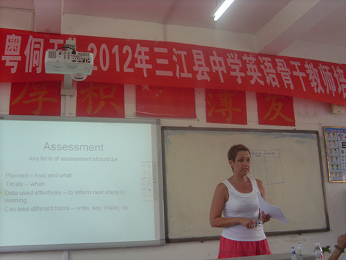 7月24日下午,英国邓迪市圣约瑟夫小学副董事长莎朗女士经过了漫长的旅途之后终于到达了三江中学。她走进课堂,给参加培训的学员们上了别开生面的一节课。她介绍英国英语教师评估和员工评估的方法,她介绍了K W L教学法,还特别提到了因材施教。讲座后半段是互动环节,学员们针对自己在教学中遇到的问题对董事长提问,莎朗董事长耐心地一一解答。