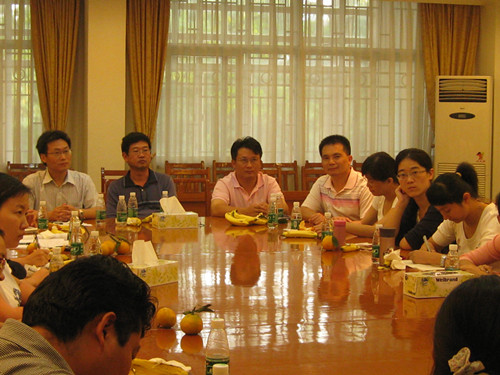 随后的座谈会由英教公司副经理董金伟主持,经理霍海洪、党委书记林绍雄及各教学部主任和部分骨干教师出席了座谈会。霍海洪首先代表公司对冯副经理一行的来访表示热烈欢迎,对华南农大和公司今年双双荣获“教育部大学英语改革示范点”表示由衷祝贺。霍海洪介绍了英教公司近年来进行大学英语教学改革的探索与实践,尤其是公司“分级教学,分类指导”的大学英语教学指导理念,确立“大学英语教学是bevictor伟德官网的根本立足点,教育学专业是公司的发展增长点”的指导思想,使公司的大学英语教学朝着更加国际化、校本化、个性化、立体化、人性化的方向不断迈进。在公司大学英语教学改革所取得的阶段性成果中,霍海洪主要谈到,公司“大学英语系列课程”被评为2011年广东省精品课程、公司成为全国外语院校大学外语教学协作会副会长单位、公司成为全国高等师范院校英语教学研究协作组广东省组长单位、以及公司青年教师曾丹在第二届“外教社杯”全国大学英语教学大赛总决赛中荣获第二名的优异成绩等。冯立新副经理也向广外的同行们通报了华南农大大学英语教学改革的情况及教改进程。华农外语公司大学英语部主任郭润玉和公司第一教学部主任郭进军、专业英语教学部主任杨小婉以及网络视听说教学部主任陈金诗分别从分级教学、网络自主学习、专业英语教学和网络视听说课程等方面介绍了各自的情况、做法、特色及优势,双方进行了富有成效的交流。随后公司朱秀全老师畅谈了其公开课的设计理念;曾丹老师向与会者分享了其参加大学英语教学大赛全国总决赛备战经历和获奖心得。双方就大学英语教学改革展开了多方面的研讨。最后林绍雄做了简短、热情的总结发言,充分肯定了此次研讨交流活动的意义。交流活动在友好、融洽、共同探讨、相互学习的气氛中结束。
