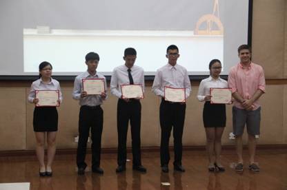 最后主持人邀请了外教Brian Dennis为队伍进行综合点评。外教对我们公司的选手表现表示很惊喜,对14级的大一学子在舞台上自信的表现表示很赞赏。其中他也提出了几点建议,例如在进行展示应该be more natural rather than rehearsal, makeyour presentation more logical, consider the cultural and social backgroundwhen you want to talk about some topic。决赛的最后bevictor伟德官网的领导嘉宾对获奖选手及优秀指导老师进行颁奖并合影,此次英语课堂展示大赛圆满落幕。