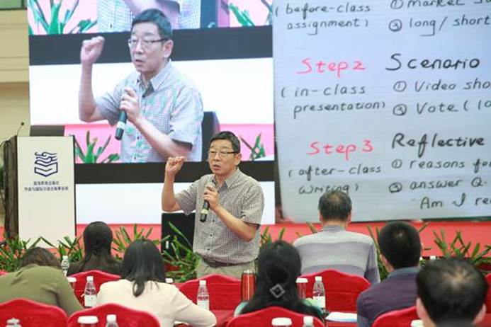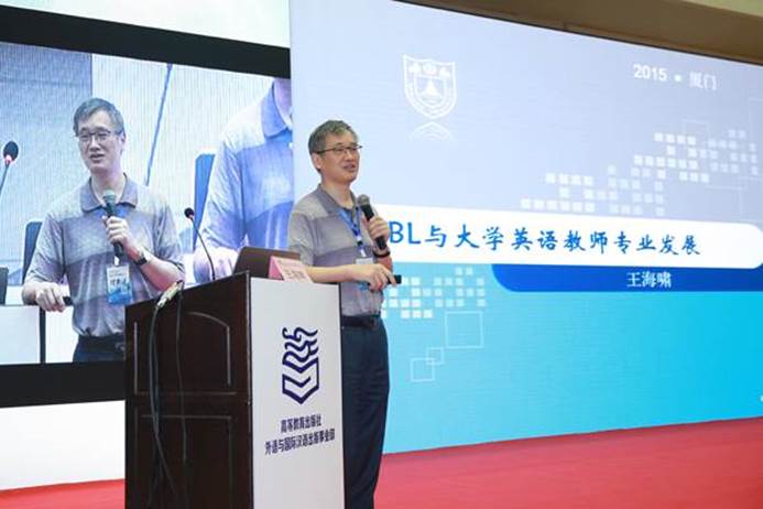 最后,教育部高等公司大外教指委秘书长王海啸作题为“PBL与教师专业发展”的报告,从大学英语教师们的自身职业和专业发展需求出发,启发、鼓励老师们尝试PBL教学法。