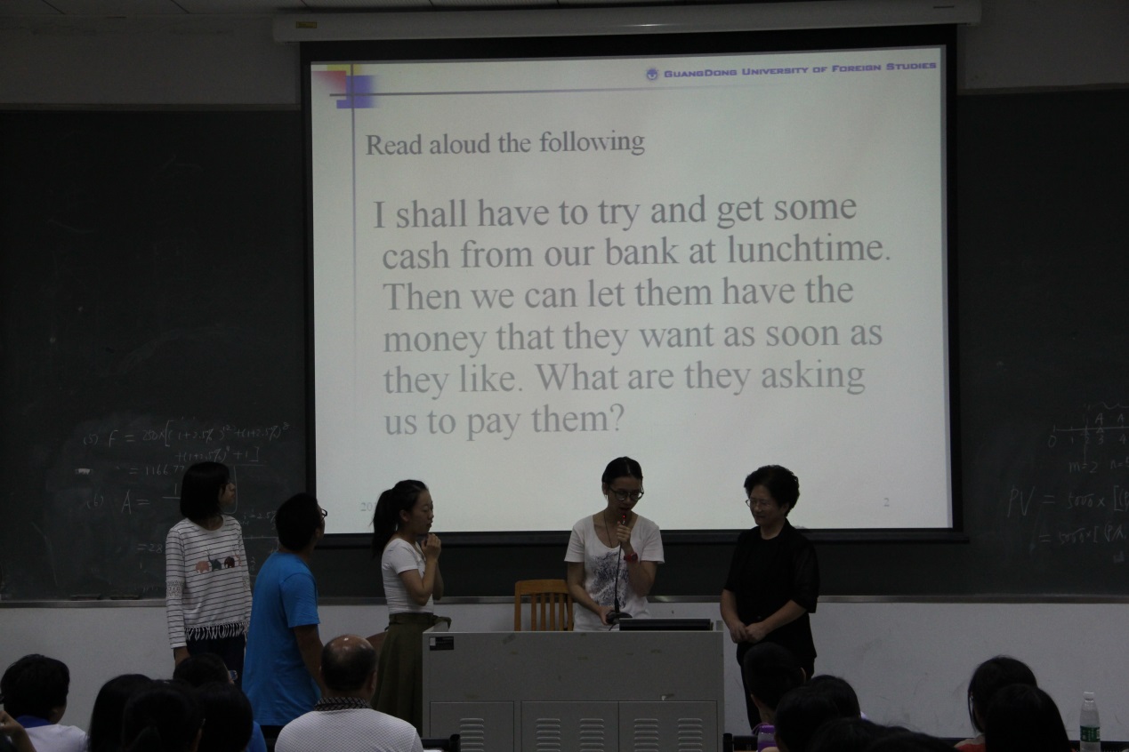 本次讲座主要分为五个部分。在讲解第一部分 “认识学习语音语调的重要性”时,王桂珍通过让同学们欣赏中国演员李冰冰的英语演讲视频、邀请同学到讲台上朗读英文短文、下发现场听力练习资料等方式,引起同学们对语音语调学习的兴趣与重视。同时王桂珍也强调,语音语调是“a need, a dream and a must”。而在讲解第二部分“认识什么叫好的语音发音”时,王桂珍提到,虽然英语作为一门世界通用的语言被大范围使用,但不同地区的英语发音也有许多不同。所以,王桂珍教授强调同学们在学习语音语调时,在“听”方面要掌握多种发音特点,做到听懂多种口音,而在“说”方面则要选择其一进行深入学习。接着,王桂珍更是分别以英国女王、英国前首相、美国总统等为例子,对不同地区所用发音进行区别与讲解,其中尤以区分英音与美音为主,并让同学们现场进行听力,尝试区分。