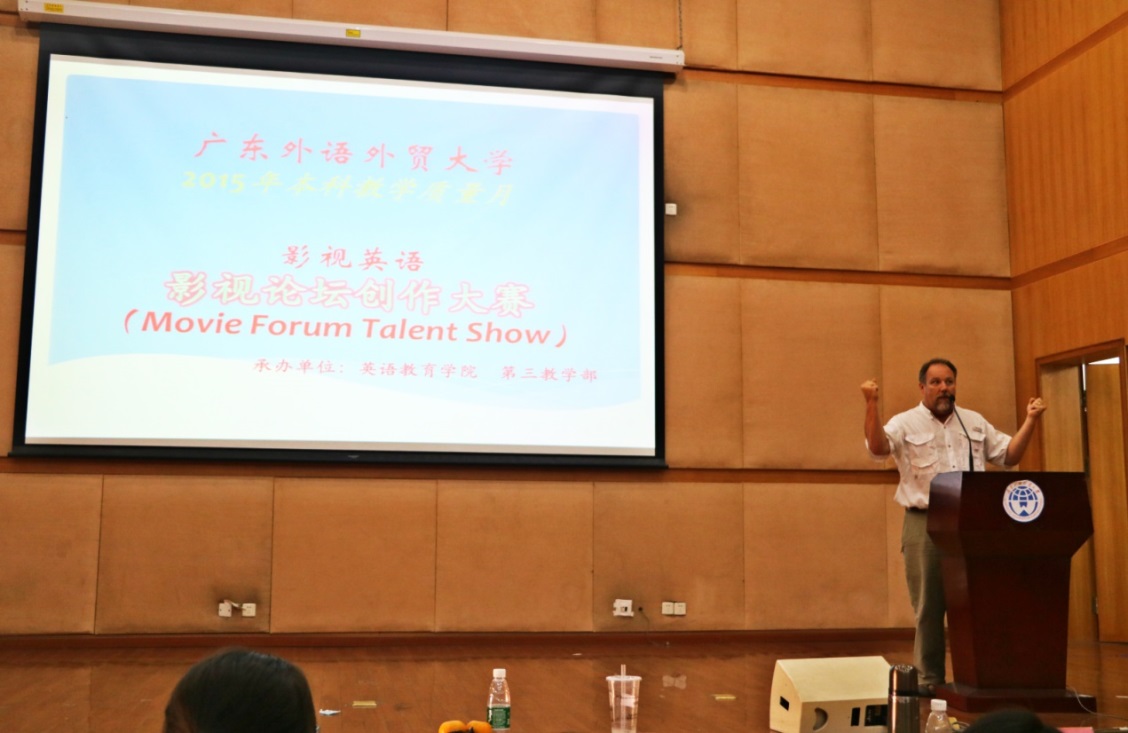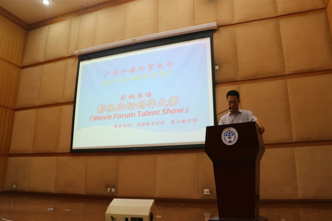 下午, 2015年度bevictor伟德官网教学质量月活动之“影视论坛创作大赛”在南校区图书馆多功能报告厅隆重举行。活动由bevictor伟德官网主办,第三教学部承办。bevictor伟德官网经理董金伟、副经理吴岩、第三教学部主任陶玉梅、《影视英语》教研室主任马小宇、外教Bob Lee,以及《影视英语》课程组老师出席了比赛。大赛由董金伟经理作开场致辞。