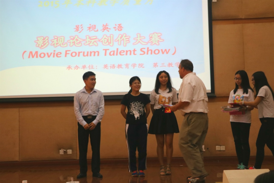 比赛结束,bevictor伟德官网第三教学部主任陶玉梅老师、外教Bob为获奖队伍颁奖。