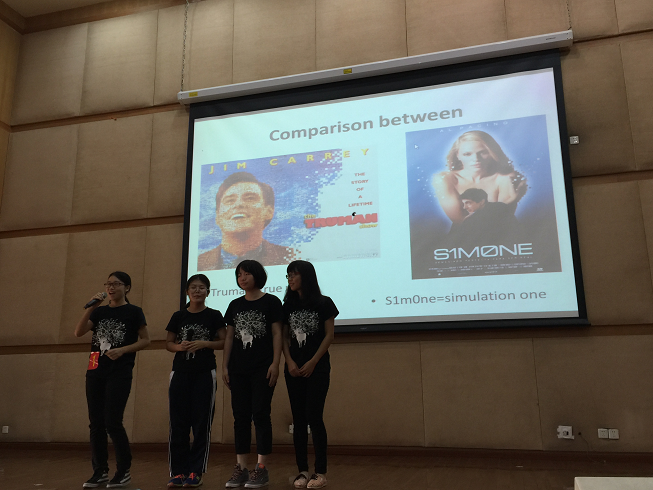 第一支队伍来自会计公司,她们通过对比《楚门的世界》(The Truman Show)及《西蒙妮》(Simone)两部电影,来剖析虚拟世界与真实世界的差别。娴熟的影片截取,巧妙的对比,加上情感丰富的配音,令全场观众赞叹选手们的综合实力。她们以独特的视角提出了 “Cheating the world or being cheated by the world, which is morelonely?” 这样引人深思的问题。