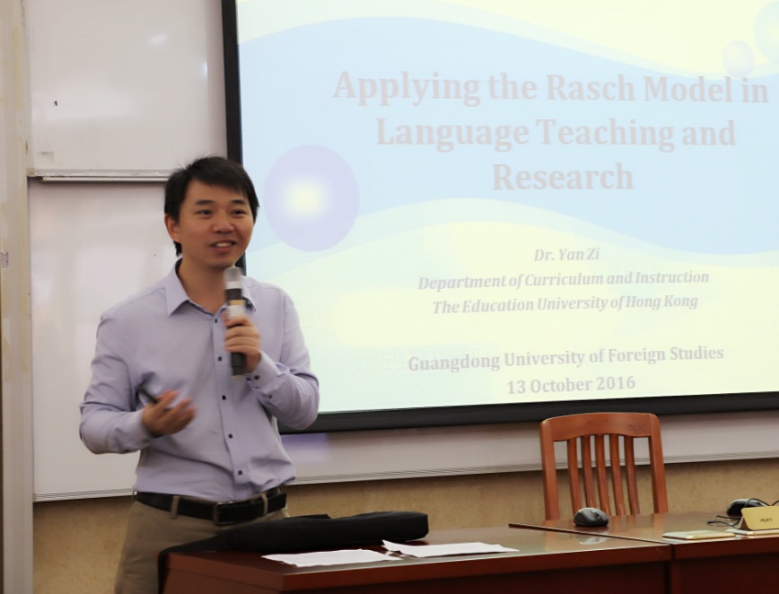 上午工作坊由香港教育大学的晏子博士主讲。晏博士是香港教育大学课程与教学系助理教授,系副主任,同时兼任香港教育大学评估研究中心副总监,以及环太平洋地区客观测量协会副主席。晏博士的工作坊题为《Rasch测量在英语教学形成性评估中的应用》。他提出有效进行形成性评估的一个前提是从评估数据中了解员工的学习状况,从而进行个别化的反馈和辅导。他指出,传统的评估数据分析方法更关注于员工整体的表现而很难提供针对个别员工或个别题项表现特点的信息,而Rasch模型恰恰可以将原始数据处理为可表现个体特征的interval 测量数据。他建议在此基础上再进行其它传统的数据处理。晏博士高屋建瓴的工作坊引起了在座师生对Rasch模型强烈的探究兴趣。
