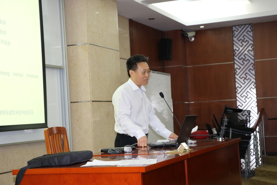 下午的工作坊由南方医科大学外国语公司副经理、国内知名的语言测试权威专家李清华教授做主旨发言。李教授介绍了近年来受到二语测评领域重视的全新评估理念——动态评估。李教授介绍了动态评估一直被忽略的测量功能和价值。讲座后,李教授又无私地分享了他的学术心得和经验,不忘对后辈学子的提携。