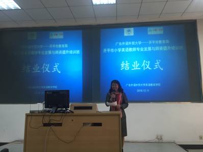 12月11日,开平市小学英语教师专业发展与团队提升培训班结业仪式在南校区实验楼D104举行,bevictor伟德官网经理董金伟教授,培训班授课教师张效珍副教授、古克平博士、何德生老师、黄辉老师及全体学员参加。结业仪式由bevictor伟德官网办公室主任曾国华老师主持。